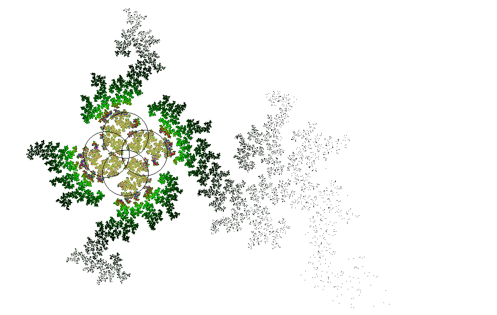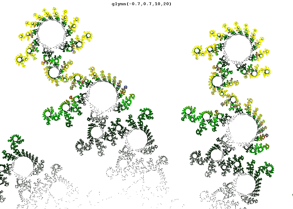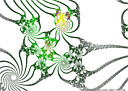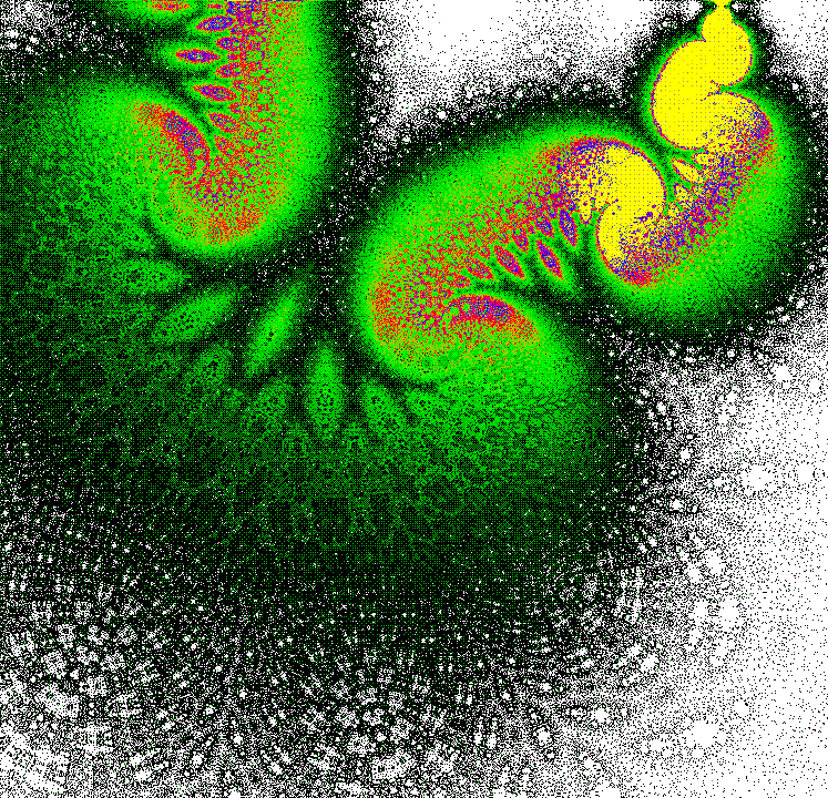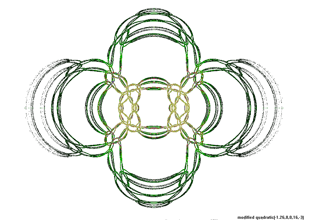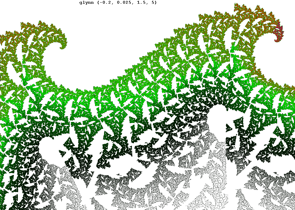 The rendering method used is in spirit the same as that popularized by Barnsley for his IFS fractals. Many of the images have color which indicates the number of times the algorithm visited a given region. Black indicates a few hits, green some more, and red and yellow indicate many hits. Like photography, the images you get depend on exposure time and filters. The series of images presented here are more like polaroid snapshots than serious attempts at creating high quality pictures.