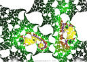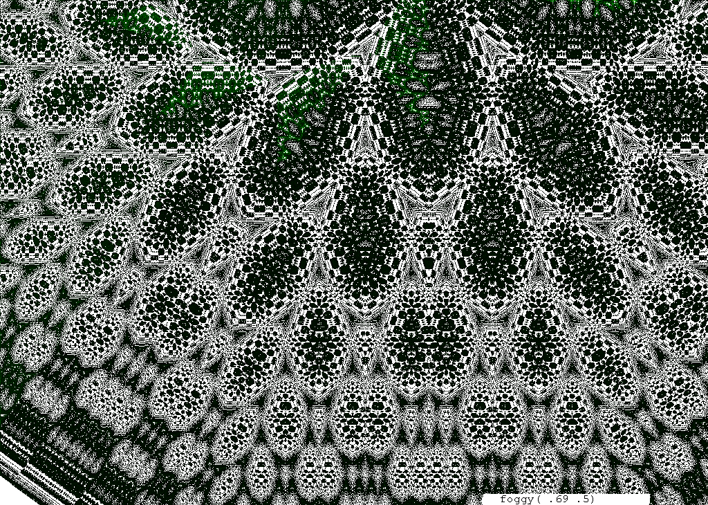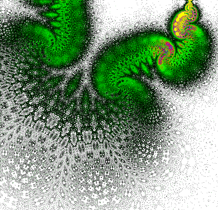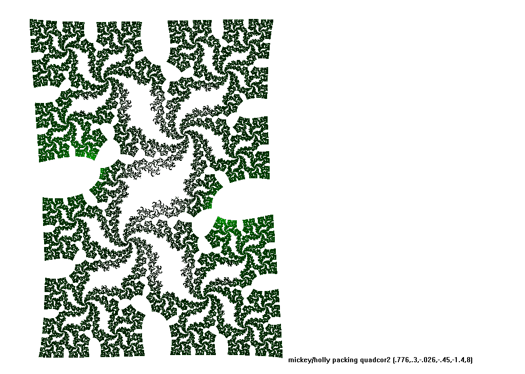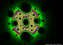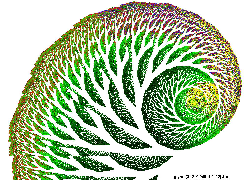 The rendering method used is in spirit the same as that popularized by Barnsley for his IFS fractals. Many of the images have color which indicates the number of times the algorithm visited a given region. Black indicates a few hits, green some more, and red and yellow indicate many hits. Like photography, the images you get depend on exposure time and filters. The series of images presented here are more like polaroid snapshots than serious attempts at creating high quality pictures.
